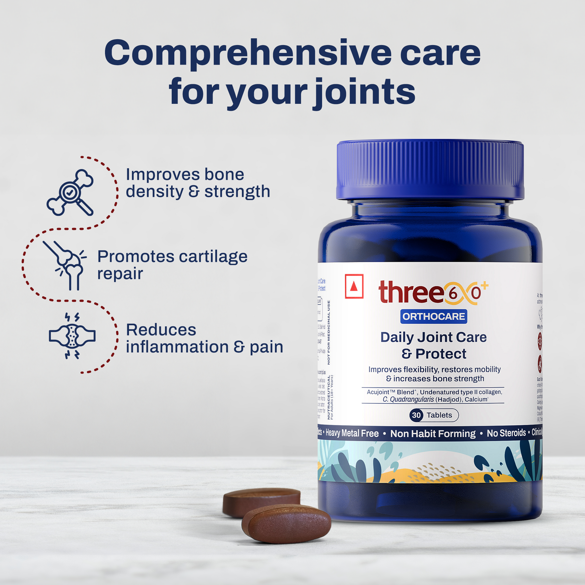 Is joint pain affecting your daily activities like walking, running, or simply going for an outing? Then three60+ Daily Joint Care & Pain Relief Combo is your go-to solution. Its research-backed ingredients protect your bone tissues from wear & tear and offer effective relief from joint pain.