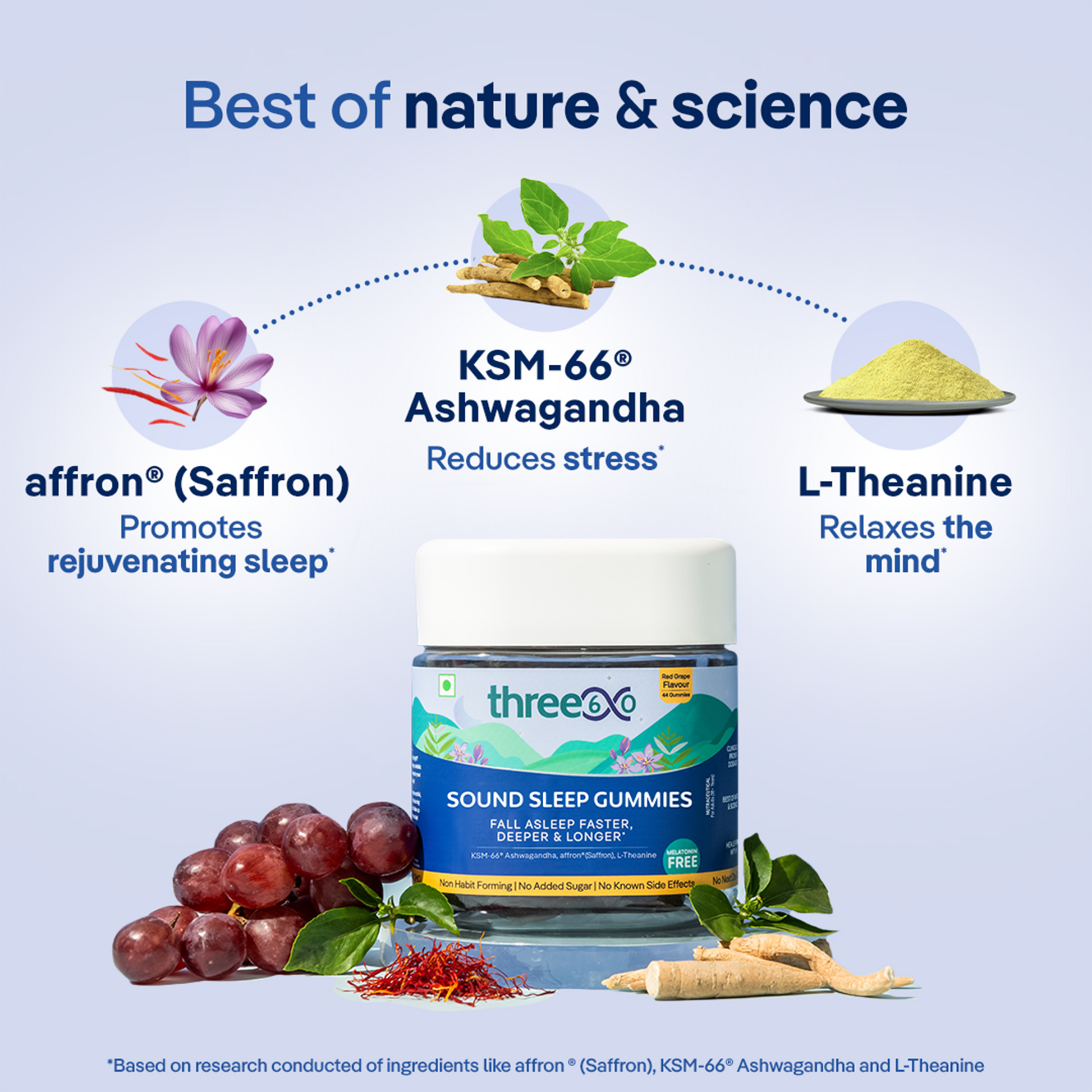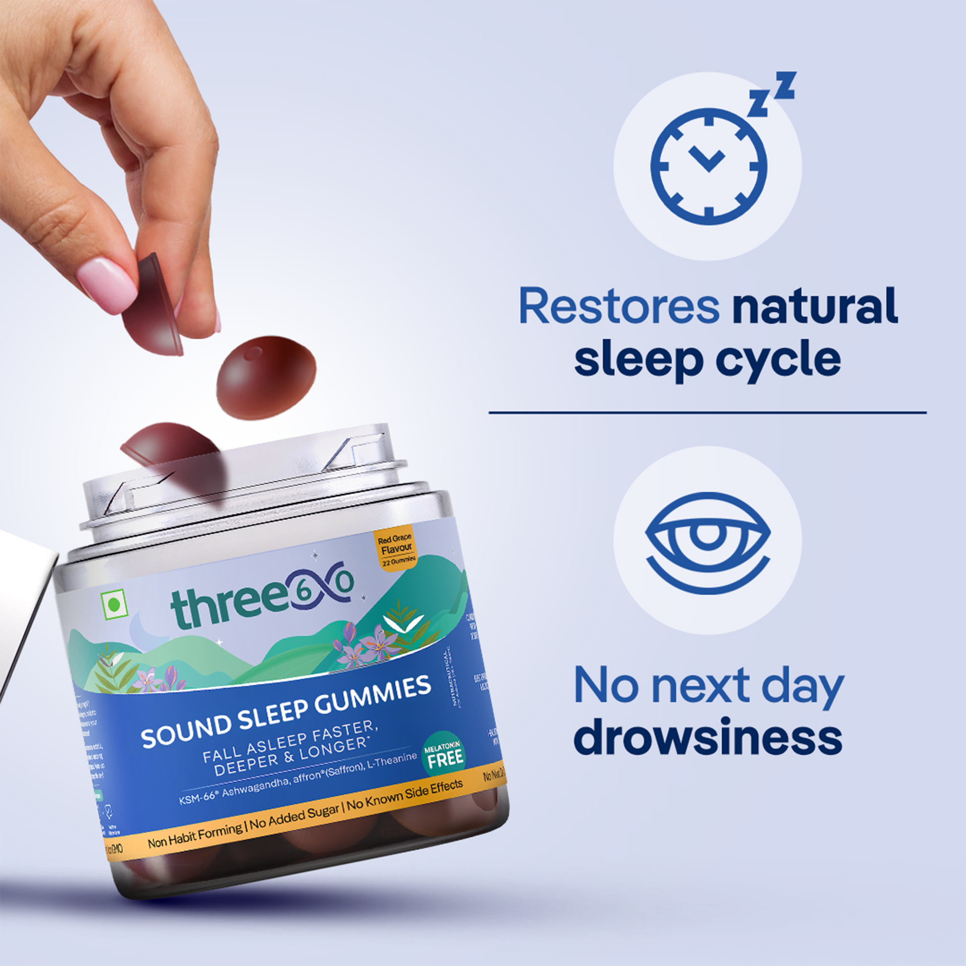 Tossing & turning every night and unable to get restful sleep? Our melatonin-free, three60 Sound Sleep gummies come to the rescue to help you catch peaceful Zzzz’s. Say goodbye to late-nighters and embrace rejuvenated & fresh mornings.