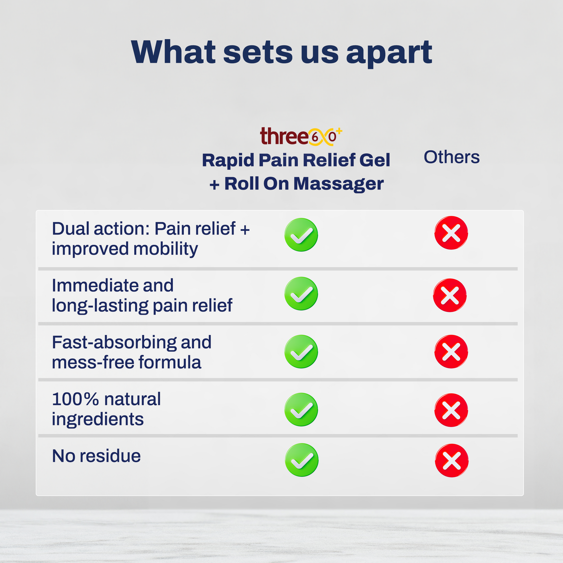 Joint pain affecting your daily tasks like running, moving, or simply sitting? Get immediate relief with three60+ Rapid Pain Relief combo. The gel is residue-free and the roll-on massager contains 5 stainless steel rollerballs for effective relief from pain and stiffness.