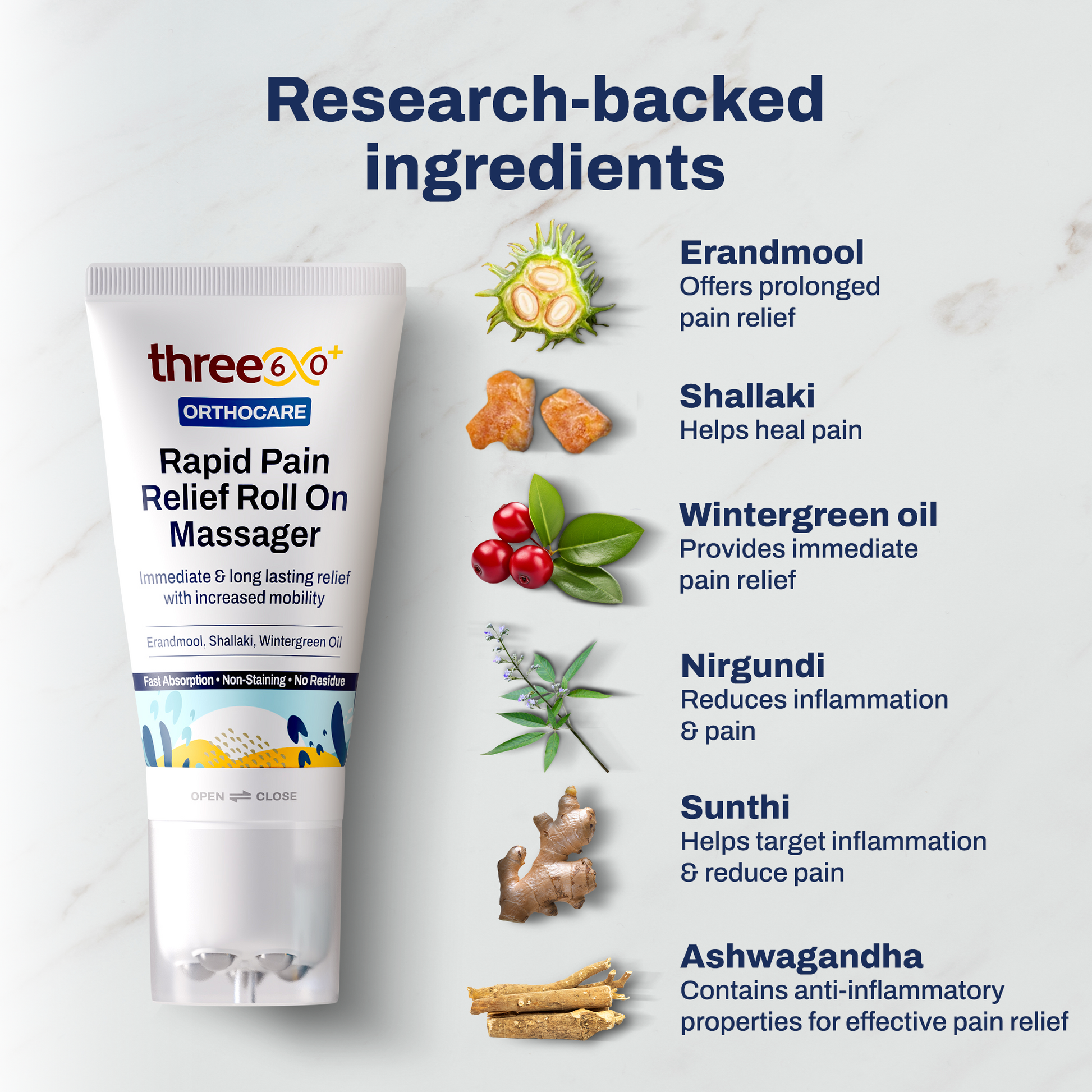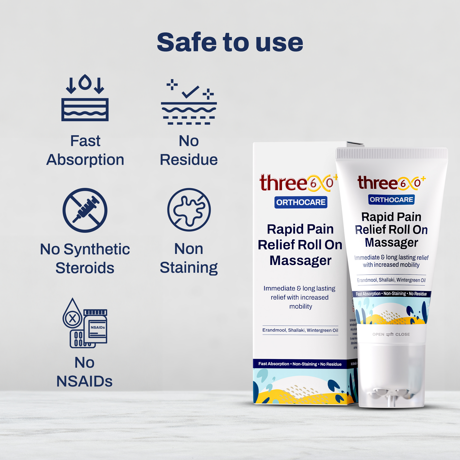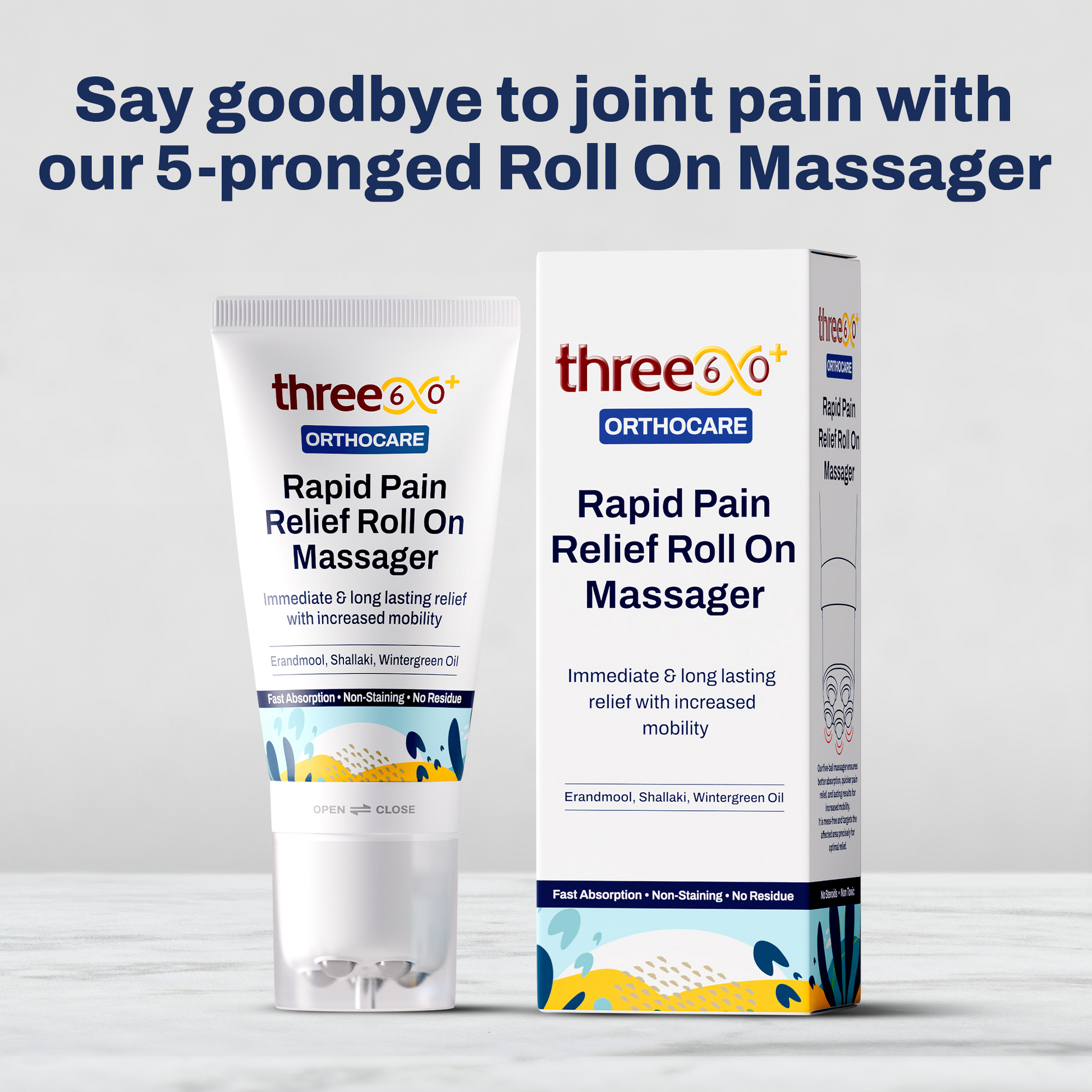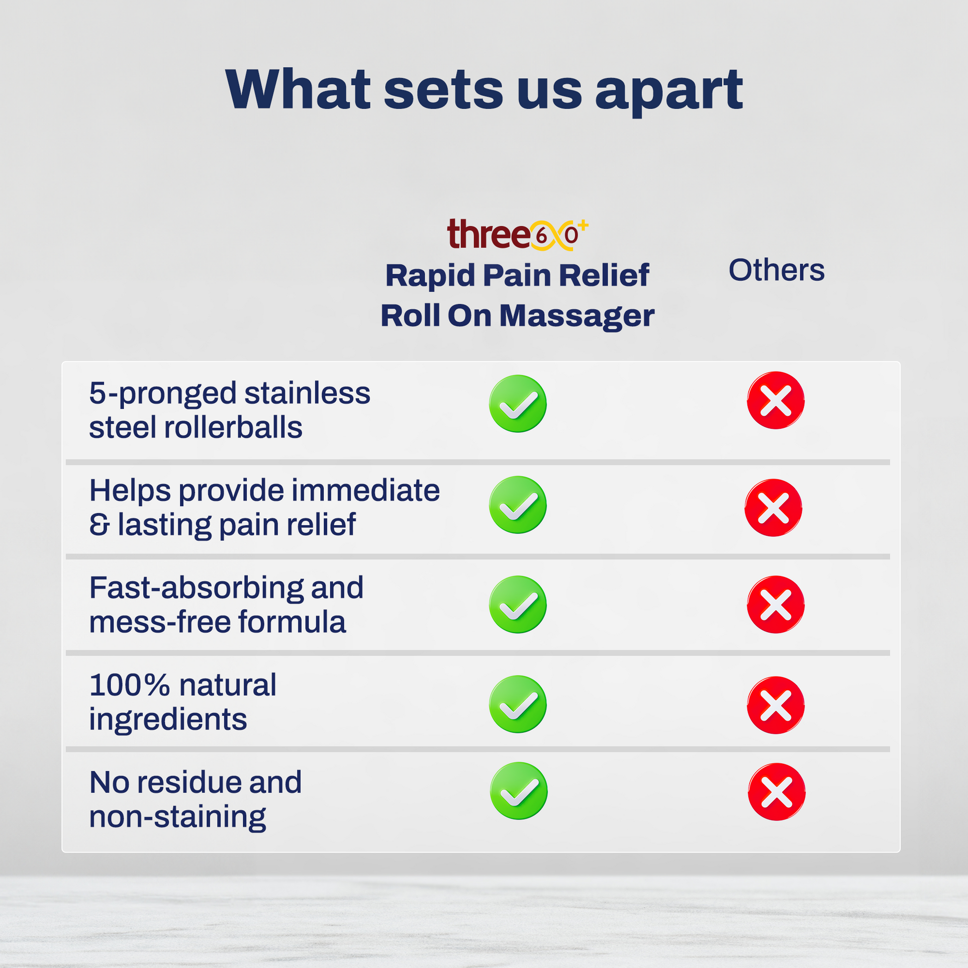 Is joint pain holding you back from enjoying long walks, exercising, running, or staying active? Try three60+ Rapid Pain Relief Roll On massager that offers effective pain relief and improved flexibility. It features 5 stainless steel rollerballs that deliver a deep tissue massage on targeted areas to relieve you from pain.